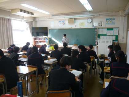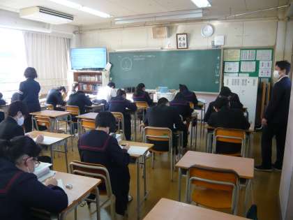 2限、3年1組は社会、卒業テストについてのお話を聞いていました。3年2組は数学、図形の問題に取り組んでいます。