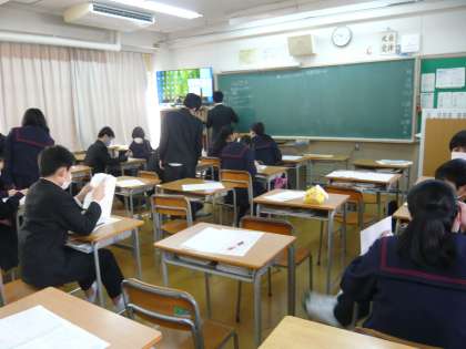 2限、3年3組は国語、奥の細道の学習です。3年4組は社会、実力テストを返してもらっていました。