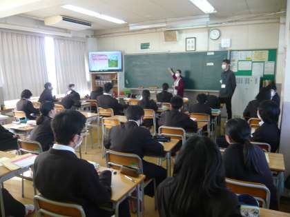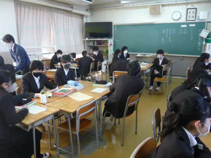 3限、1年3組は英語、デイビッド先生について教科書の英文を読んでいます。1年4組は国語、スピーチ原稿の発表の準備をしています。