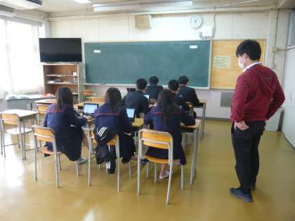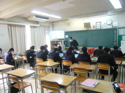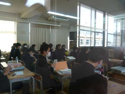 3限、3年3組は英語の分割授業、タブレットを使って英文や単語の課題に取り組んでいます。先生いわく、「紙でやるより集中している」。3年4組は国語、これから今日の学習の本題に入るところでした。後ろのドアがかたく、廊下から写しました。