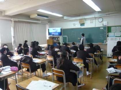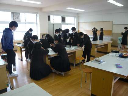 3限、1年1組は理科、川の流れによる土砂の堆積の様子を再現する実験を映像で見ていました。1年2組は家庭、被服室で手作りマスクをつくっています。