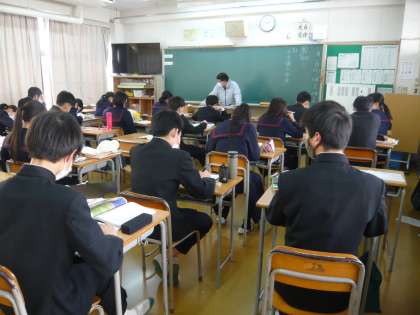 5限、3年3組は社会、日本地理の復習問題をやっています。都道府県のことなど日本地理の学習は、小4から中2までの空白の期間があるためか、意外とみんな苦手にしているようです。3年4組は国語、「不思議な画面」という教材を学習しています。