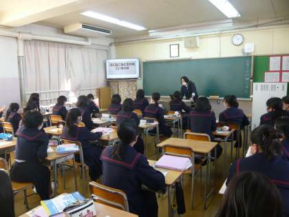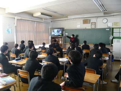5限、2年1・2組は保健の授業です。男子は、1組の教室で救急救命について映像を見て学んでいました。ちょうど、AEDの使い方についてのところでした。2年1・2組の女子は、2組の教室で震災について学習しています。「次に起こると言われているのは」という問いに「南海トラフ地震」と一斉に多くの生徒が答えていました。