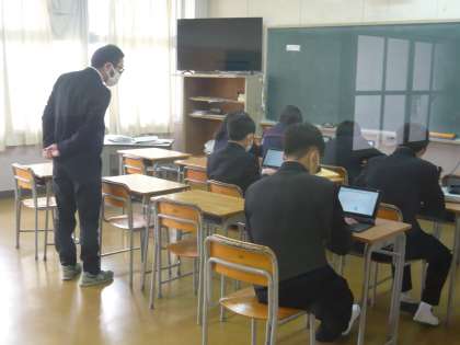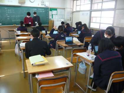 4限、3年3組は国語、漢字の小テストをしているところでした。3年4組は英語分割授業、タブレットを使って演習です。