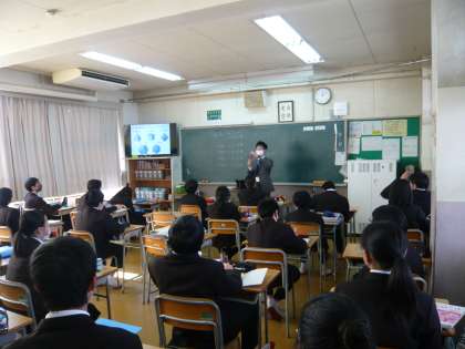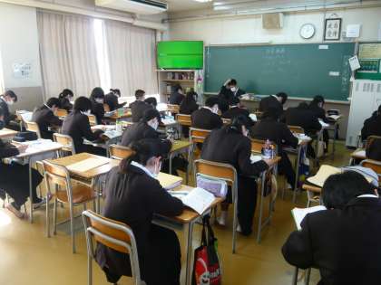 4限、1年3組は数学、正多面体について学んでいます。画像だけではなく、模型でも確認しています。1年4組は英語、自習課題を静かにやっています。