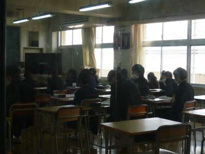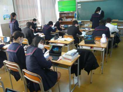 5限、3年1組は社会、これからタブレットを使って入試対策の学習をしようとしています。3年2組は音楽、プリントを見て、先生の問いに答えていました。