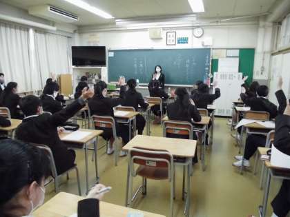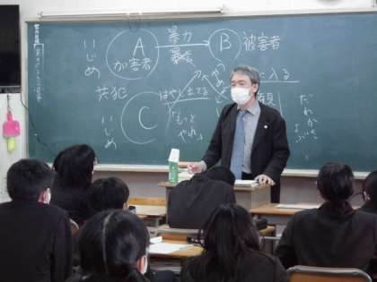 6限、1年生は、弁護士の先生をお招きして、クラスごとにいじめ防止出張授業を行いました。市教委より担当指導主事の先生も見学に来られました。