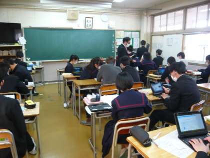 6限、3年1組は社会、黒板に年代がいくつも書かれてあって、「次の年に何があったか分かりますか?」とありました。794年とか1192年とか1600年くらいはすぐに分かりますが、全部は覚えていませんでした。3年2組は英語、これからタブレットを使って学習するようです。