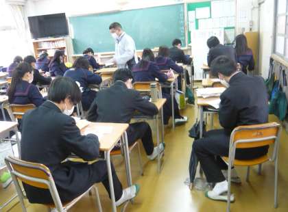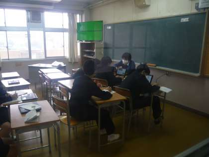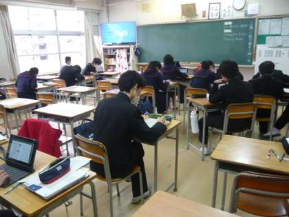 3限、3年3組は英語分割授業、タブレットを使って学習しています。3年4組は国語、漢字の小テストが終わったところです。