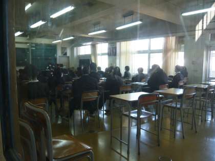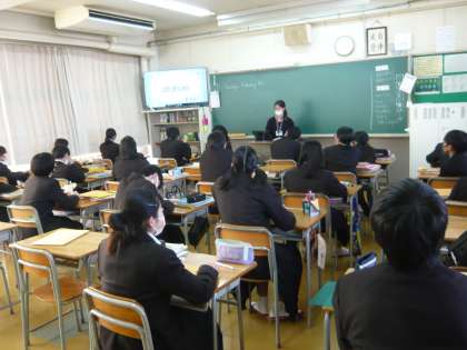 6限、1年3組は音楽、リコーダーの練習をする曲のメロディを聴いています。1年4組は英語、単語の発音練習をしています。かなり上手に発音できる人もいます。