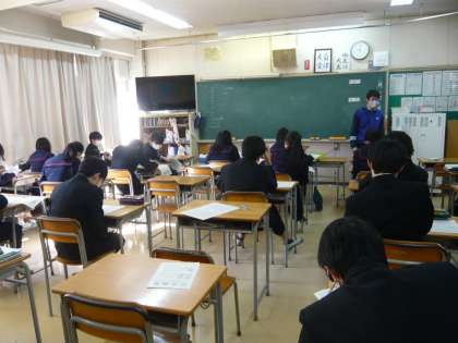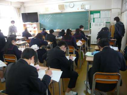 2限、3年3組は理科、プリントの問題に取り組んでいました。3年4組は数学、図形の学習です。