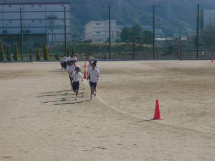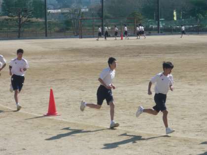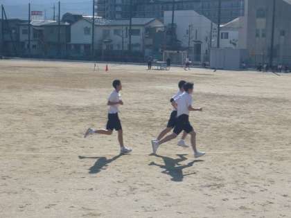 2限、2年1・2組の男子体育は、グラウンドで持久走です。12分間でどれだけの距離を走れるかに挑戦しています。先頭グループには先生から「3000mペース」と声が飛んでいましたので、3000mを超える生徒も出てくるかもしれません。