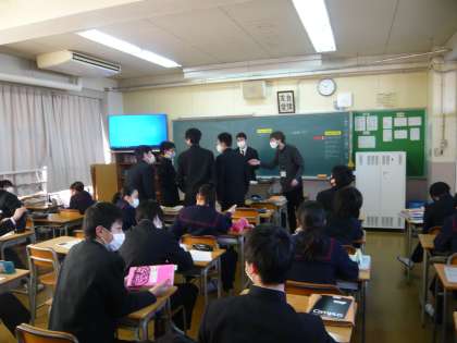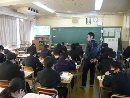 2限、2年3組は英語、班ごとに立って英語で会話しています。デイビッド先生に聞いてもらっています。2年4組は理科、学年末テストに向けて、電流と磁界の問題に取り組んでいます。