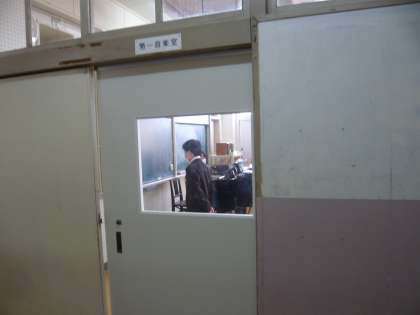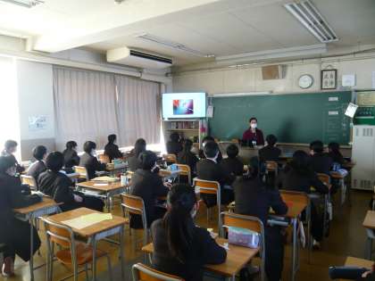 2限、1年3組は音楽、歌のテストのようです。みんなから離れて、黒板に向かって歌っているのが何となくつらいです。ここには写っていませんが、次に歌う人もかなり間隔をとって待っています。1年4組は英語、学年の先生の得意や苦手なものを画面に映して、英語で答えています。