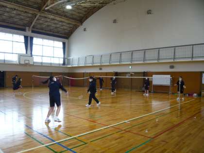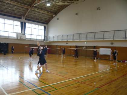 2月19日(金)3限、3年1・2組の女子体育は、体育館でバドミントンです。とても楽しそうです。