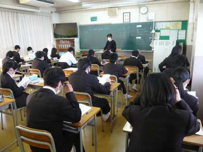 4限、1年3組は家庭、テスト返しが終わってこれから住まいのはたらきについて、ワークで勉強します。1年4組は音楽、テスト返しの後、先生の話を聞いています。