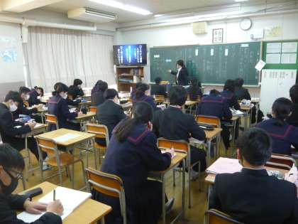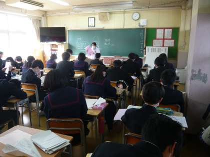 1限、2年1組は国語、助動詞の学習をしています。2年2組は理科、プリントの問題に取り組んでいます。