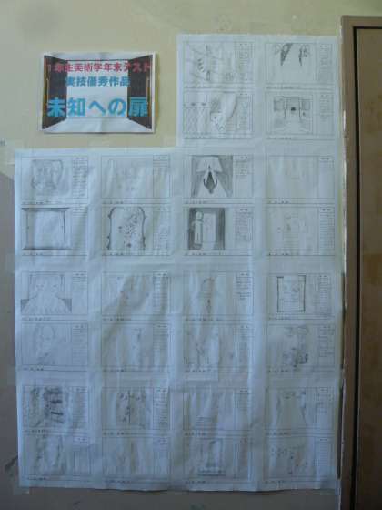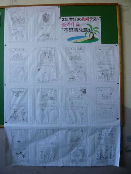 学年末テストの課題は、1年が「未知への扉」2年が「不思議な島」です。階段壁面に優秀作品が掲示されています。絵も上手ですが、その発想が素晴らしいです。3年生の卒業制作、陶芸スクラッチ皿の写真も掲示されています。
