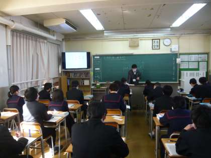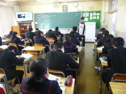 1限、2年3組は理科、発電のしくみを勉強しています。2年4組は数学、確率の学習です。