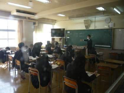 1限、1年3組は数学分割授業、立体の堆積を求める方法について学んでいます。1年4組は美術、セロハンで作るステンドグラス制作中です。