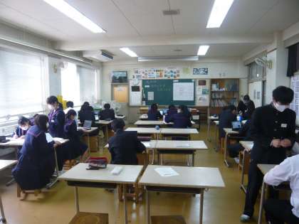 3限、3年3組は美術、「マイブック」の仕上げです。タブレットで絵や言葉を検索しています。3年4組は数学、プリントの図形の問題を解いているのでしょうか。結構難問なのか、真剣に取り組んでいます。