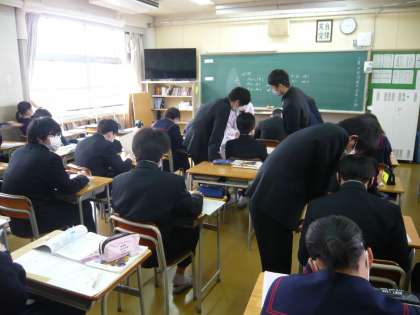 1限、2年3組は数学、確率について学習しています。2年4組は理科、プリントの問題に教え合いも入れながら取り組んでいます。
