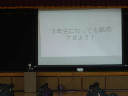 各クラス代表の人から本の紹介等があった後、各クラス、学年全体の1年間の振り返りと来年度に向けての話がありました。最高学年に向けての決意が強く感じられました。