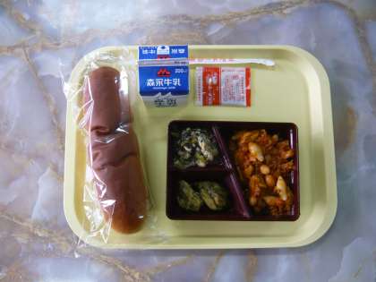 本日の給食はパンです。牛乳にはミルメークがついています。混ぜるとコーヒー牛乳になります。