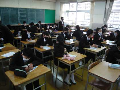 5限、1年1組は家庭、中学校での家庭科の学習について説明を聞いています。1年2組は特活、中学校での抱負、決意のようなものを書いています。