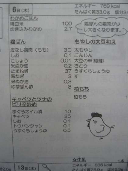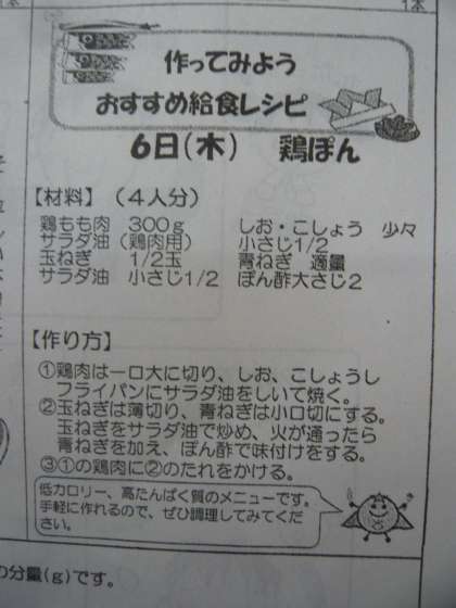 4月21日以来、久しぶりの給食です。「鳥ぽん」は、5月の給食だよりに作り方が載っていました。また、こどもの日にちなんで柏もちがついています。