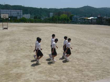 3限、2年1・2組の男子体育は、グラウンドでグループごとに集団行動の発表です。
