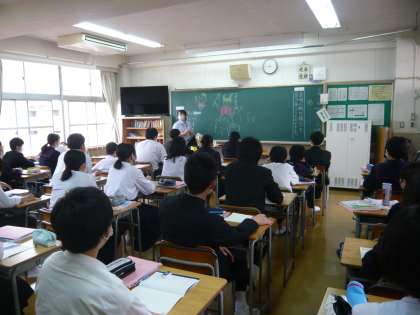 1限、3年3組は数学、分割の授業です。「等差数列」について学んでいます。3年4組は国語、先生が、今日学習する教材のあらすじについて、登場人物の絵をチョークで描いて説明されています。