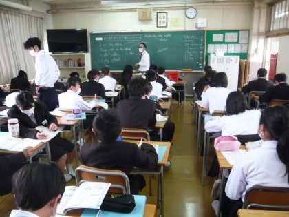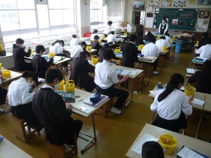 1限、1年1組は美術、ひらがなレタリングです。美しく仕上がっています。1年2組は英語、自己紹介の文を英語で書いています。1年3組は数学、正の数、負の数の加法・減法の復習です。