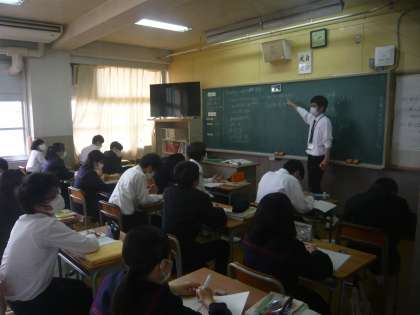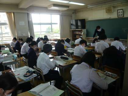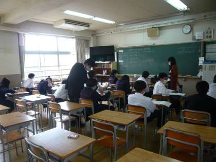 5限、3年1組は数学、分割授業で式の展開について学習しています。3年2組は社会、プリントの答え合わせです。毎日の積み重ねが力になっていきます。