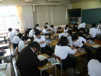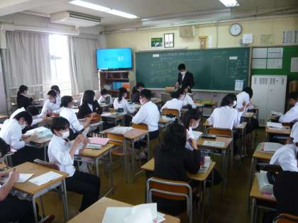 5限、2年1組は数学、代入の方法を学んでいます。2年2組は社会、日本の気候についての学習です。2年3組は理科、自習プリントに取り組んでいました。