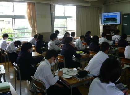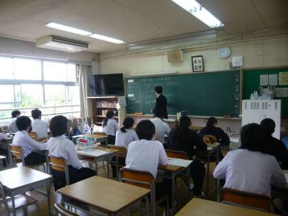 1限、3年1組は社会、モニターの写真を見て問題に答えています。訪問したときには、正倉院の写真が写っていました。3年2組は数学、分割で式の展開の学習をしています。