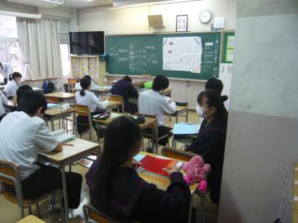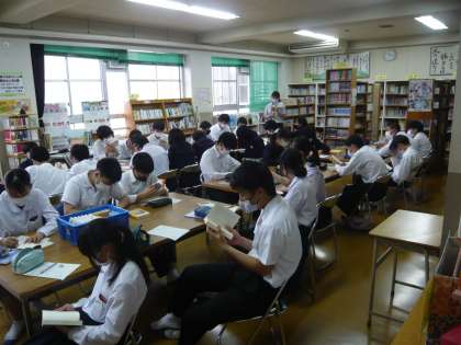 2限、3年3組は理科第二分野、細胞分裂等について学習しています。3年4組は国語、図書室で図書の時間です。