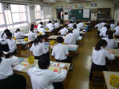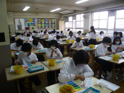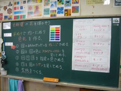 2限、1年3組は美術、「色相環」というものに取り組んでいきます。