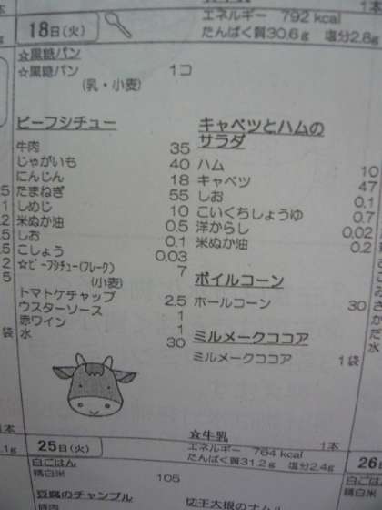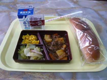 本日の献立は、黒糖パン、ビーフシチュー、キャベツとハムのサラダ、ボイルコーン、ミルメークココア、牛乳です。