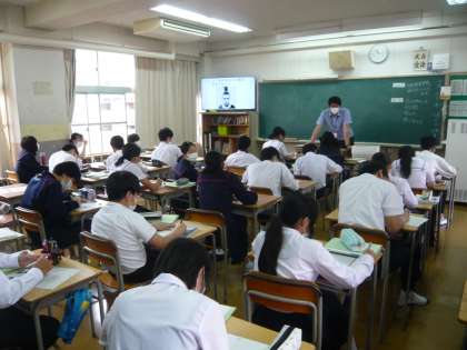 3限、3年3組は理科第一分野、化学式のテスト中でした。3年4組は社会、いつものようにモニターの画面を見て問いに答えています。ちょうど、徳川慶喜の写真が映されていました。