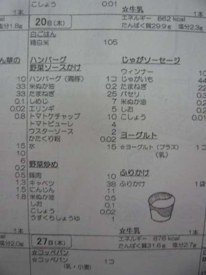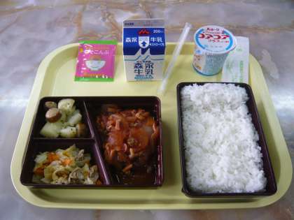 本日の献立は、白ごはん、ハンバーグ野菜ソースかけ、野菜炒め、じゃがソーセージ、ヨーグルト、ふりかけ、牛乳です。