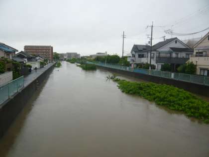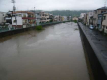 鍋田川の谷川橋からの写真です。少しずつ水位は下がってきましたが、引き続き注意して登校してください。