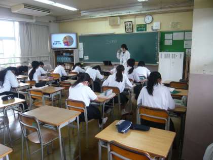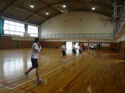 4限、2年3組女子は保健、中学校で起こるケガについて考えています。2年3組男子は体育館で体育、シャトルランでがんばっています。
