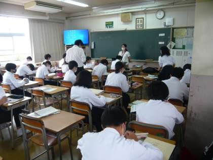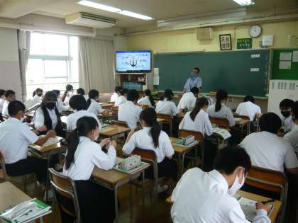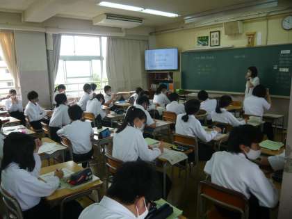 4限、2年1組は英語、ワーク(ビンゴ)の時間です。2年2組は家庭、家族の健康を守る家庭内の環境についてです。2年3組は理科、心臓のしくみ?について学習しています。