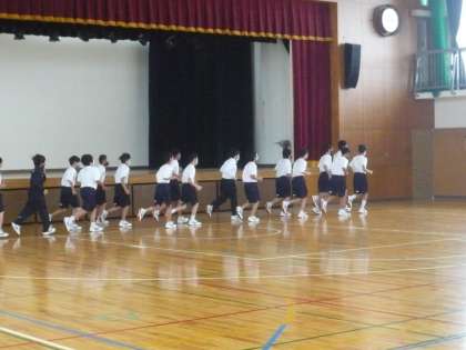 4限、1年3組は体育。最後に紹介しますが、実は、4限の最初に見に行きました。男子体育館、女子グラウンド。ウォーミングアップでジョギングやラジオ体操の時間でした。