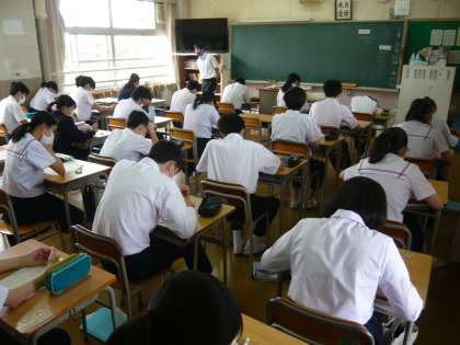 2限、3年1組は英語、単元テストに向けて勉強しています。3年2組は理科第一分野、化学式の小テストに取り組んでいます。