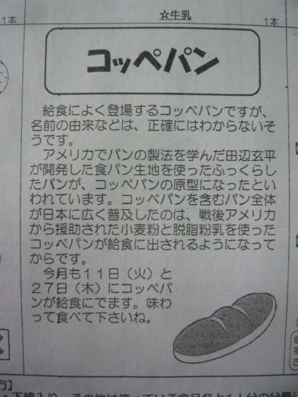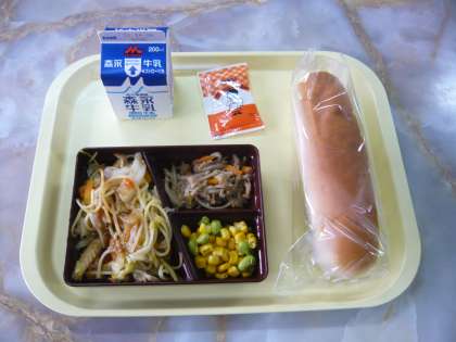今日の給食には、11日以来、コッペパンが再び登場しました。焼きそばみたいな「焼きスパゲティ」がおかずについています。