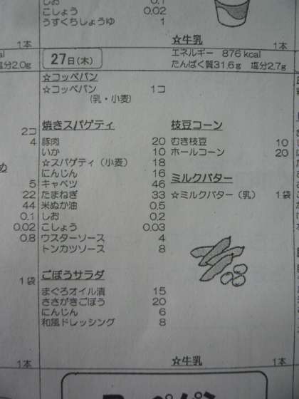 本日の献立は、コッペパン、焼きスパゲティ、ごぼうサラダ、枝豆コーン、ミルクバター、牛乳です。