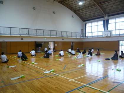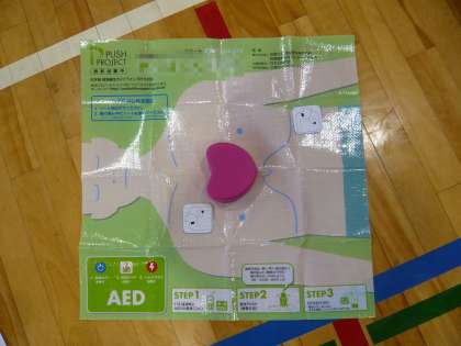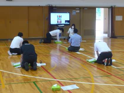 放課後、職員研修として、救命救急(心肺蘇生法)の研修を行いました。救命処置についての映像資料を視聴し、各自、心肺蘇生トレーニングキットを活用して心臓マッサージやAED装着の演習を行いました。