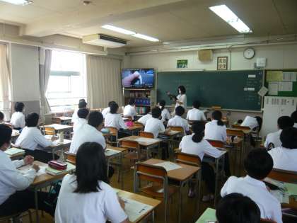 2限、2年1組は家庭、生活騒音について考えています。2年2組は数学、連立方程式の問題の解説を聞いています。2年3組は英語、「読みトレ」という教材を使って英文を読み取る練習をしています。
